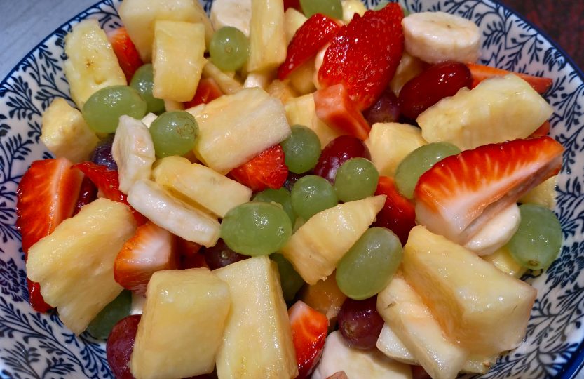 Ima li što ljepše nego početak proljeća proslaviti sa sočnom i šarenom salatom od voća? Moja omiljena kombinacija su jagode, borovnice, ananas, banane, grožđe, dinja…. U voće po izboru potrebno je samo dodati sok od limete (ili limuna) i kome treba malo šećera ili sirupa od agave.